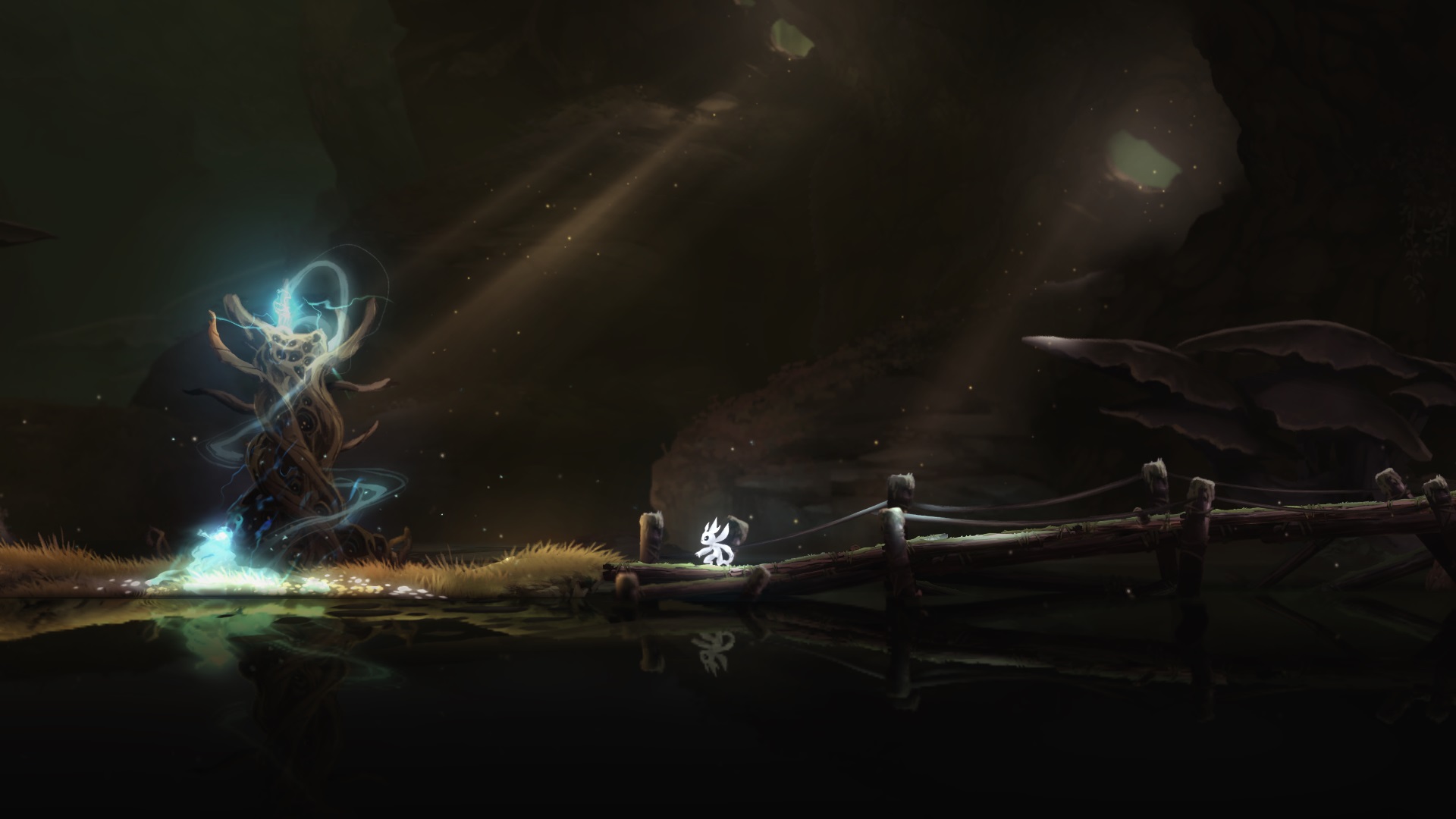 The game tells the story of Ori, a white guardian spirit who is lost and later adopted by the creature Naru who raises him as her own child. The forest which they call home begins to die and soon Ori begins a journey to restore it back to health. That’s keeping it VERY brief but I really think the storytelling is great in the beginning as it is told is a series of player controlled vignettes and voice overs. It’s a touching tale that hits the right chords emotionally.