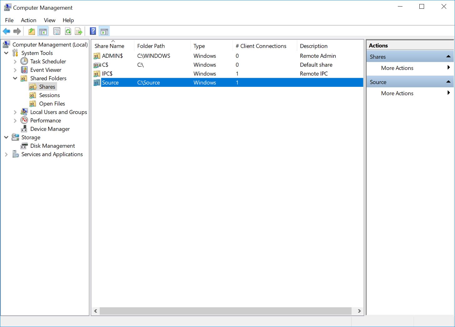 Luckily there’s an easy way to find these shared folders via Computer Management. In the File Explorer right click on the PC icon and select Manage – this will open the Computer Management application. From the left panel go to System Tools, Shared Folders and finally Shares which lists all the shared folder currently set up on the machine.