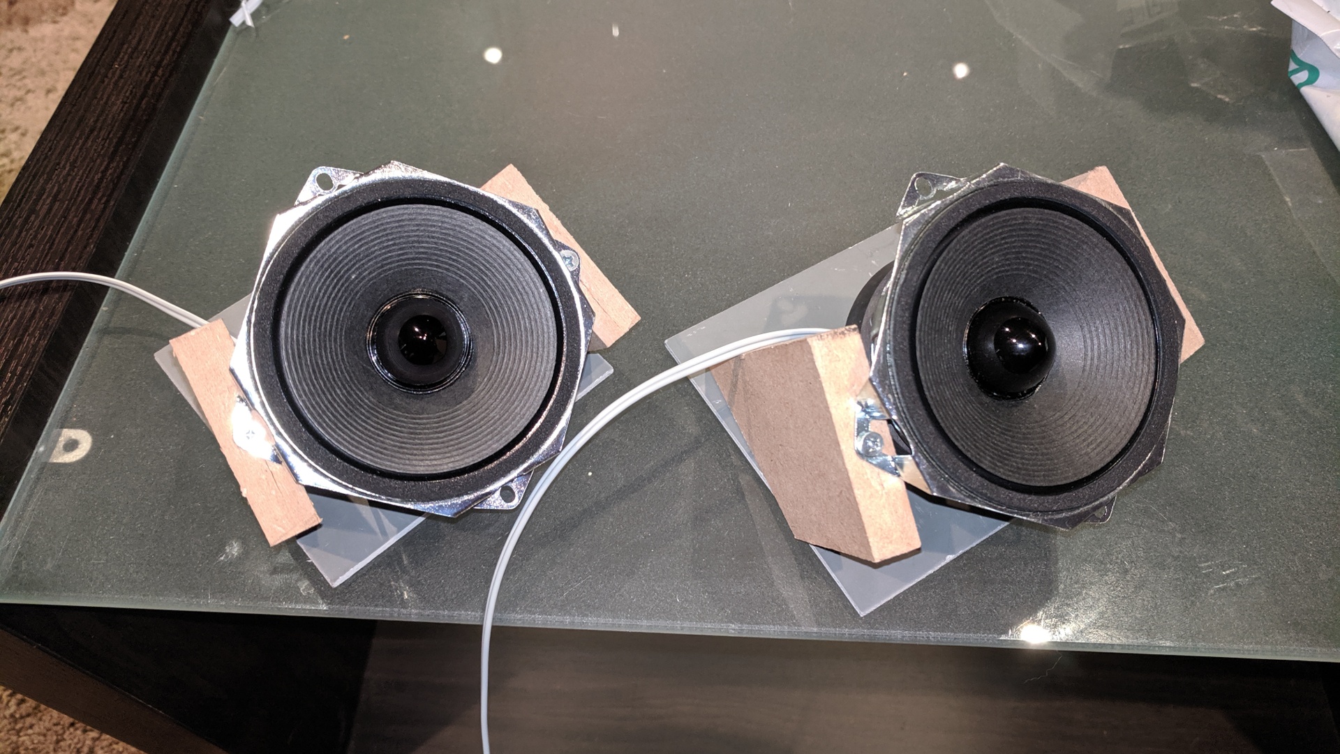 To ensure the speakers were positioned appropriately I put together a pair of simple stands with made from scraps that pointed them towards the player. They didn’t need to look pretty just to keep them off the floor of the cabinet. One they were put together I placed them inside and fixed them down using removable mounting strips. I also cut down the length of the speaker wires and tidied it up before the construction was done.