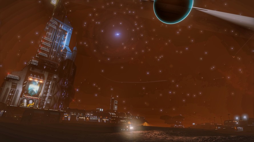 Anyway, the approach to Sacaqawea Space Port in system Skaudai CH-B d14-34 went as planned and involved another stop in a nebula which from a visual standpoint really help to judge progress over the long trips. Stopping by on a planet gave me an opportunity to jump into a rover and make a lap of the space port. The sky here had a strong reddish tinge to it which was a sight I hadn’t seen before. Stupidly I fired the rover’s turret in the vicinity of the settlement and received a fine that locked me out of system services until I paid up. Unfortunately there weren’t any contacts or Interstellar Factors reps stationed there so I couldn’t fix the problem so it was best to move on again. Hopefully my next stop will let me remedy my dumb mistake.