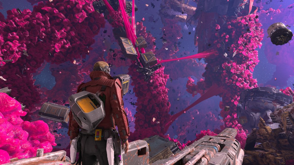 Visually the game is striking with some incredibly imaginative worlds to travel through and plenty of bold colour choices that steer things away from greys and browns. The recent patch for consoles also enabled ray tracing which helps add to the fidelity further but at the cost of resolution. But to be honest the game looks so good you don’t really notice and I was happily taking screenshots knowing that they were all looking good and the game even includes a photo mode to! The character models are outstanding – unlike Avengers they don’t try to mimic their MCU counterparts too closely and it works better here. A nice touch though is you can unlock outfits from the GotG movies and the flavour text used with them is humourously appropriate. Quill’s ship, the Milano, has been given a lot of attention with its interior reflecting its occupants appropriately, especially in their own private quarters. Like the Millennium Falcon or Serenity, the ship is a character and it looks great.