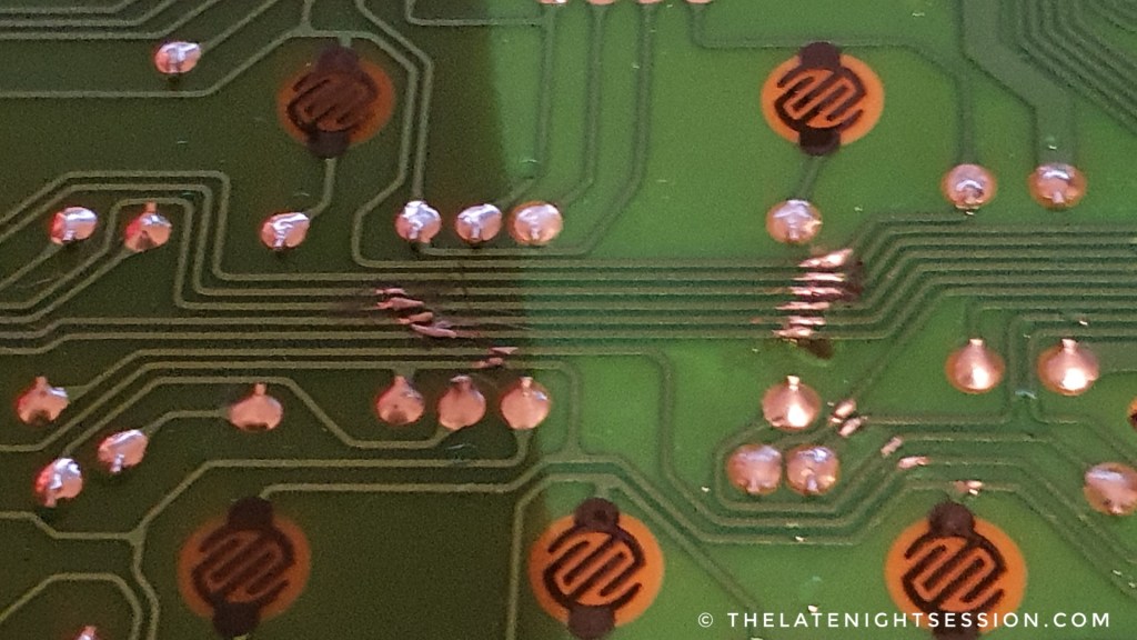 Thinking it might be more dirt, etc messing up the contacts I opened up the case and pulled apart the keyboard to check it over again. Because I knew exactly which keys were causing problems now I looked a lot closer at the circuit board and noticed a few of the traces were significantly deformed and lifted from the board itself. That explained why the keys weren’t working but how it happened still needed a bit more investigating. Flipping over the board soon confirmed the problem: the tiny crack in the back of the board at the same location as the deformed traces which looked to me like impact damage. My guess is perhaps something had dropped on the keyboard hard enough for the circuit board to flex, hit the internal casing and crack.