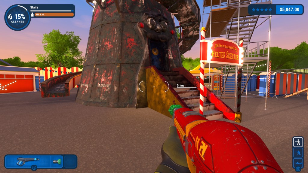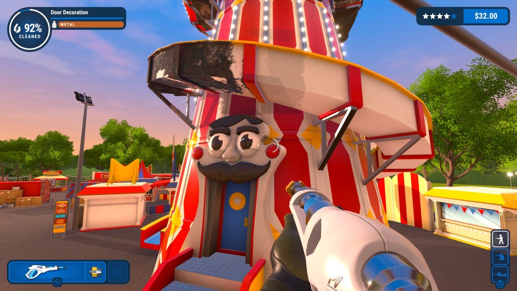 The mechanics of the game are simple – you have to clean everything. For something like a golf cart it’s clear what you have to clean up (ie. all of it) and the game does assist with a menu that gives you percentage cleaned of individual parts so that you can identify where you’ve “missed a spot”. This becomes even more useful with locations that require a lot more agility in finding the parts requiring a clean. Additional items like ladders and scaffolding are available in some areas that require extra help in reaching places. The locations are usually to more challenging jobs due to scale and finding a method that lets you clean efficiently and understanding what tools you have available will assist on that too as you will may lean on specific attachments more than others by the way they clean.