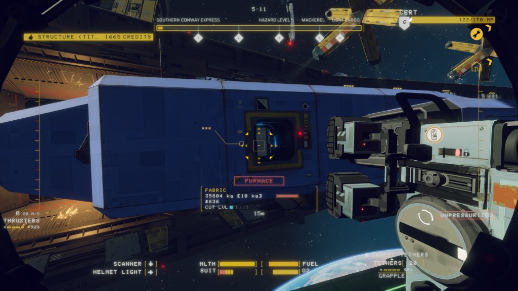 You begin the game with two tools: a cutter and a grapple. The first allows you to burn through linking struts that hold together most ship structures and it comes with an alternate mode that will slice through sections which is useful when dealing with larger components. The grapple is your means to grab parts removed from ships and send them off to the right place for processing. An alternate mode with the grapple is the tether that allows you to link up parts to move them around or send them to be processed in a line. These and more of your inventory (such as your suit and helmet) can be upgraded over time as you level up and earn credits for successful salvages.
