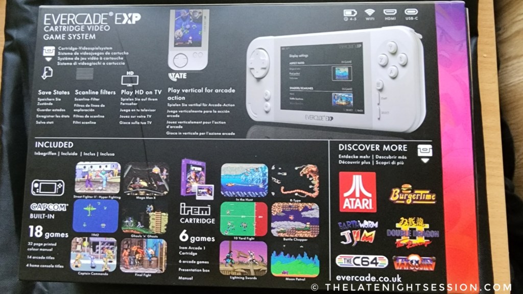 After months of procrastination, I finally decided to pick up the Evercade EXP handheld, the third console release from Blaze after the original Everade handheld and the TV connecting Evercade VS console. Choosing the EXP was a little easier thanks to it being bundled with a number of Capcom titles in the console plus an cartridge of Irem arcade games that included one of my favourite shooters in R-Type. For me it was the ideal bundle to start with. The package the unit comes in is pretty compact with the handheld, a USB-C charge cable and the Irem Arcade collection. It’s all nicely presented which helps reinforce this is professionally built product and makes it feel like a platform and not a gimmick.